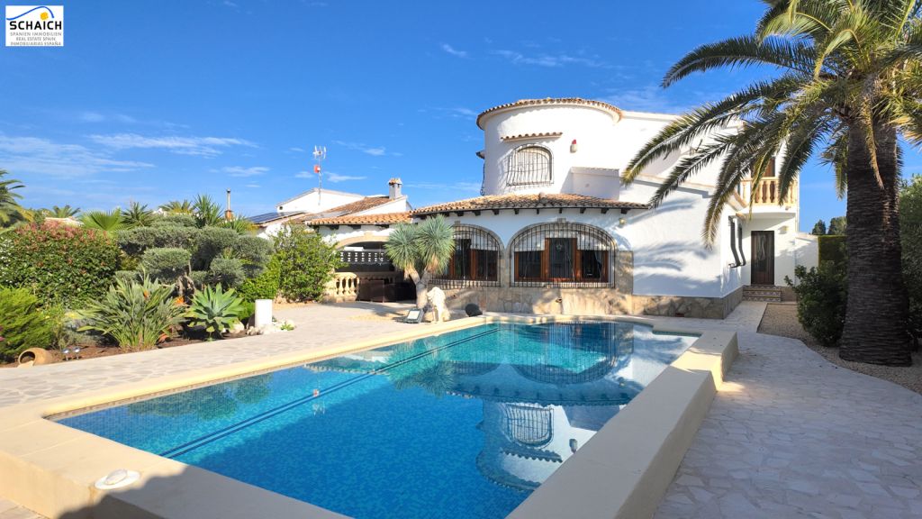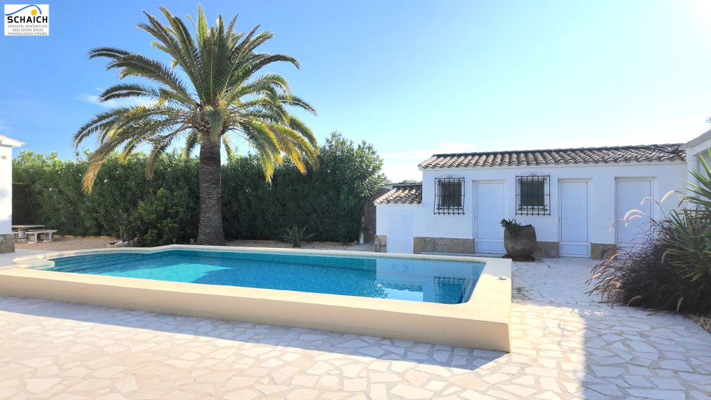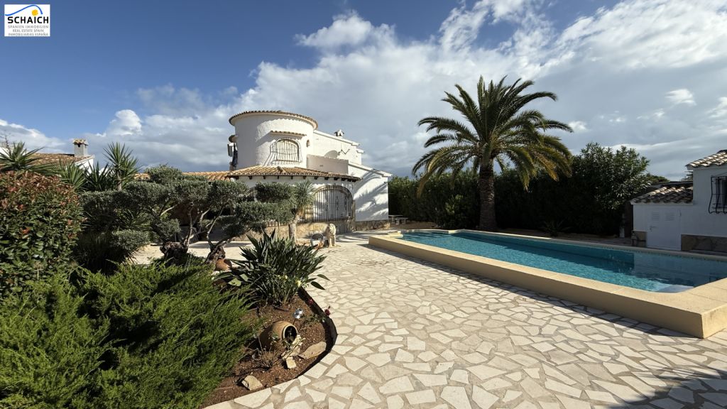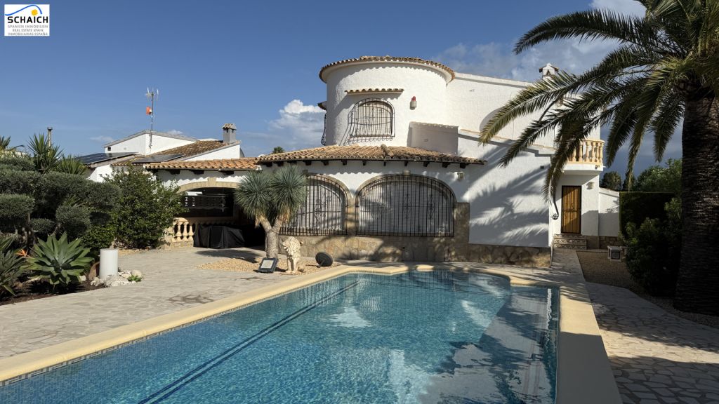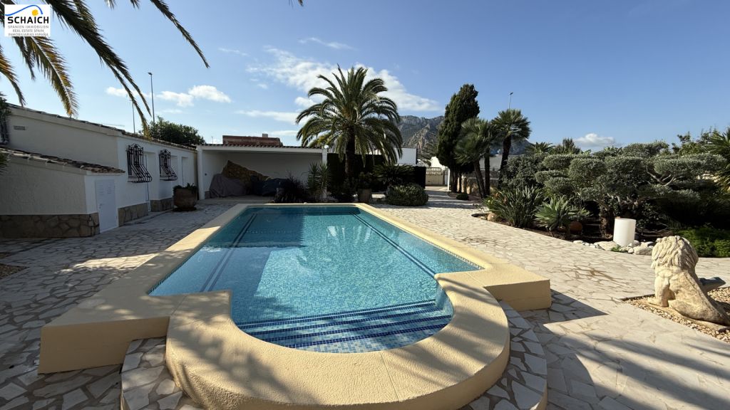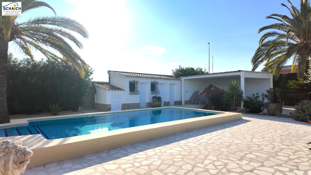 The villa features a modern Nolte kitchen and 2 gas fireplaces installed in the living rooms. It is heated and cooled via a special heat pump, and the pool can be heated for year-round enjoyment.Very nice residential area, quiet and sunny. In the immediate vicinity there are DIY stores, shops, cafés, petrol stations, restaurants, etc. The beach is about 1.2 km away and can be easily reached on foot or by bike.Masonry construction, ceramic floors, wooden windows, wooden doors, security grilles, roller shutters, 2 gas fireplaces, heat pump for heating and cooling, Nolte fitted kitchen, built-in wardrobes, heated pool (recently retiled), carport, parking space, electric entrance gate, various outbuildings, covered solid pergola, beautiful garden, outdoor lighting, and much more.The furniture is partially included in the price. The property’s documentation is completely up to date and in order. A notary appointment can be arranged at short notice.