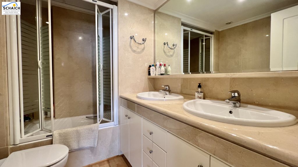 The master bedroom with terrace access offers a quiet retreat with plenty of privacy. The bathrooms are fitted to a high standard, some with double sinks and bathtub/shower.