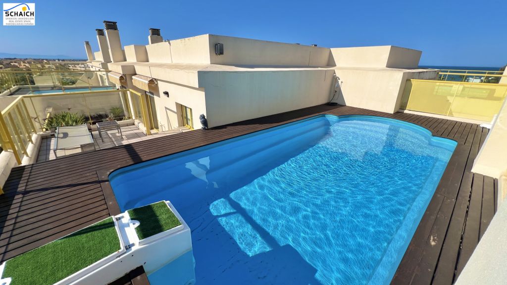 In an attractive location in Denia, this exceptional duplex penthouse is a real highlight for discerning buyers. Spacious rooms, high-quality materials and several large terraces – topped off by a private pool on the roof terrace – make this property a rare opportunity.Upon entering, you are immediately impressed by the stylish entrance hall with its open staircase and warm cherry wood floors, which continue throughout the entire living area.