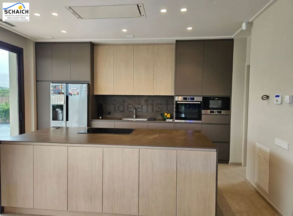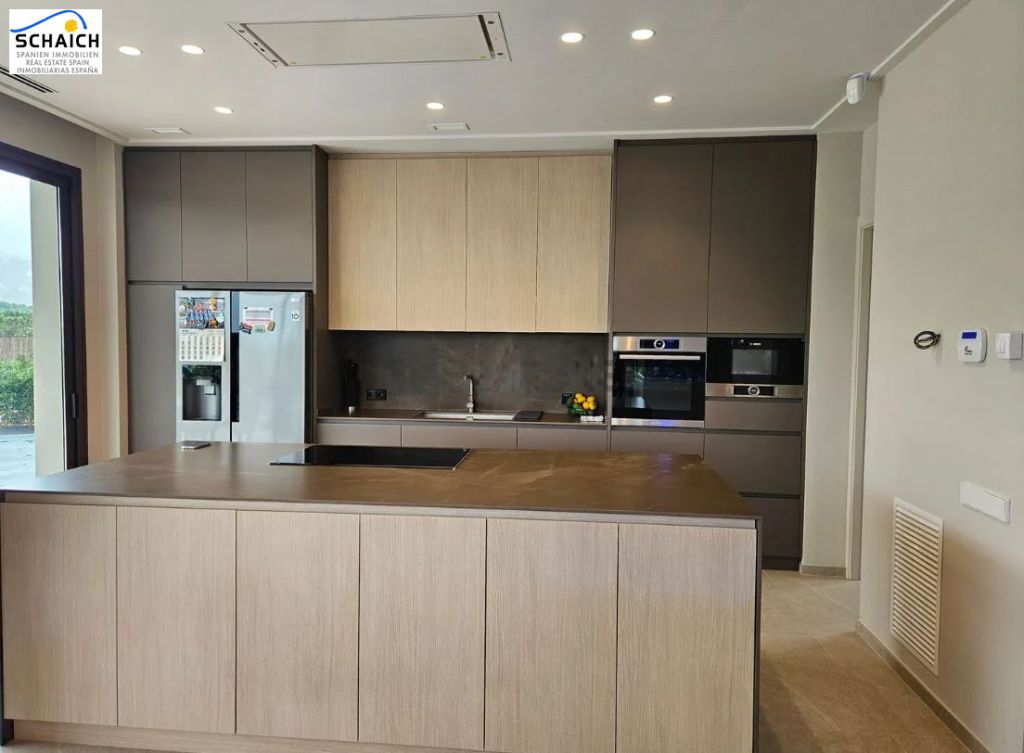 The kitchen is fully equipped with Bosch appliances, includes a wine cellar, a generous central island, and an American-style fridge, and is open to the dining and living areas.