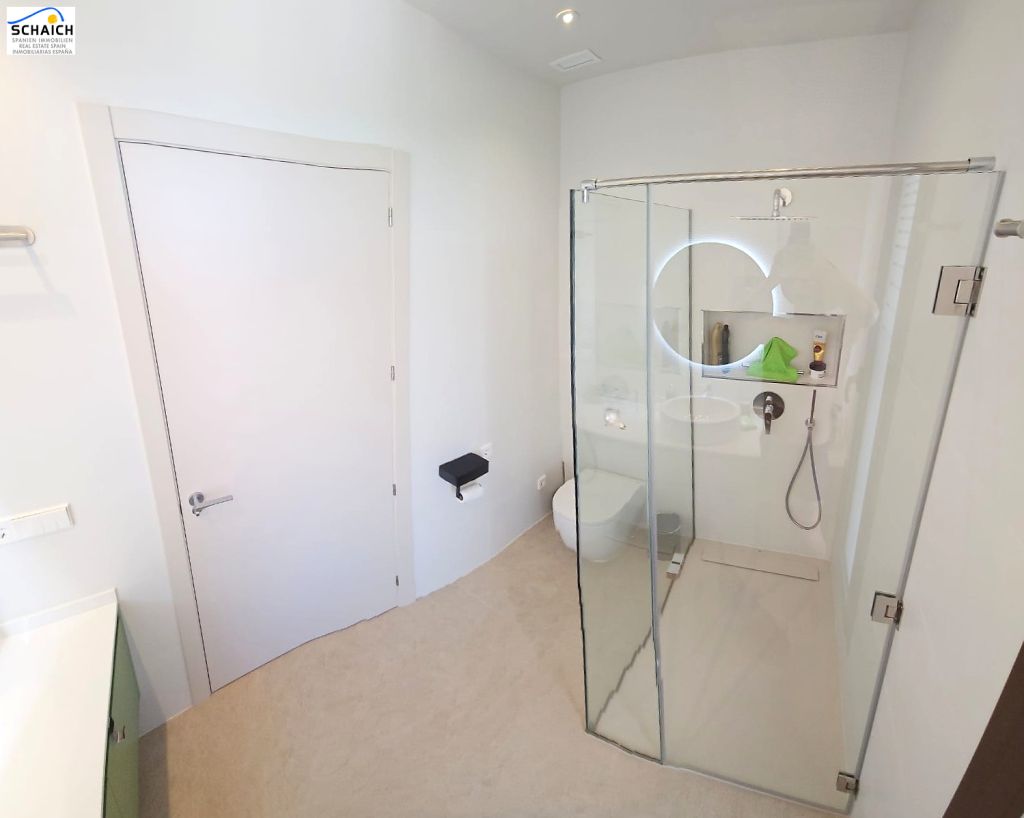 The villa offers three double bedrooms, each with access to a terrace, creating perfect spaces for relaxation. In addition, there are two modern shower rooms, a separate guest toilet, and a practical utility room with a heat pump boiler, space for a washing machine, and a sink unit.