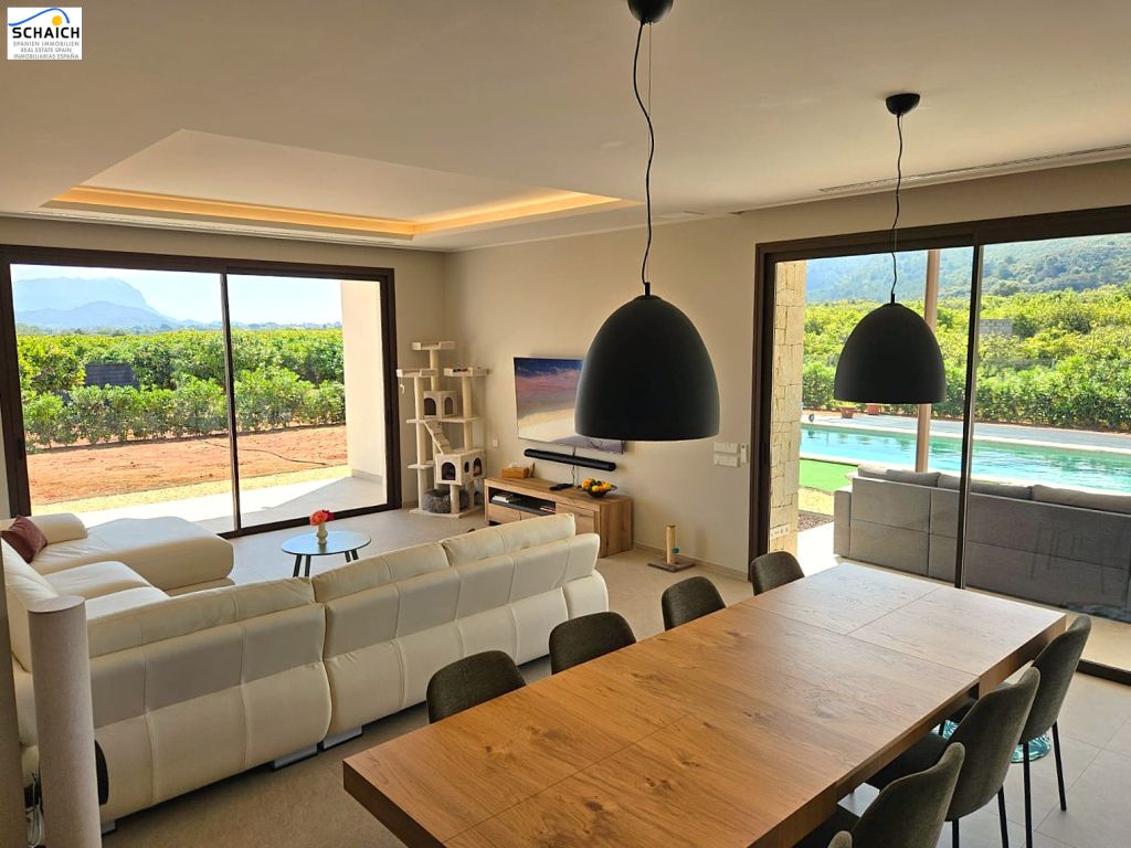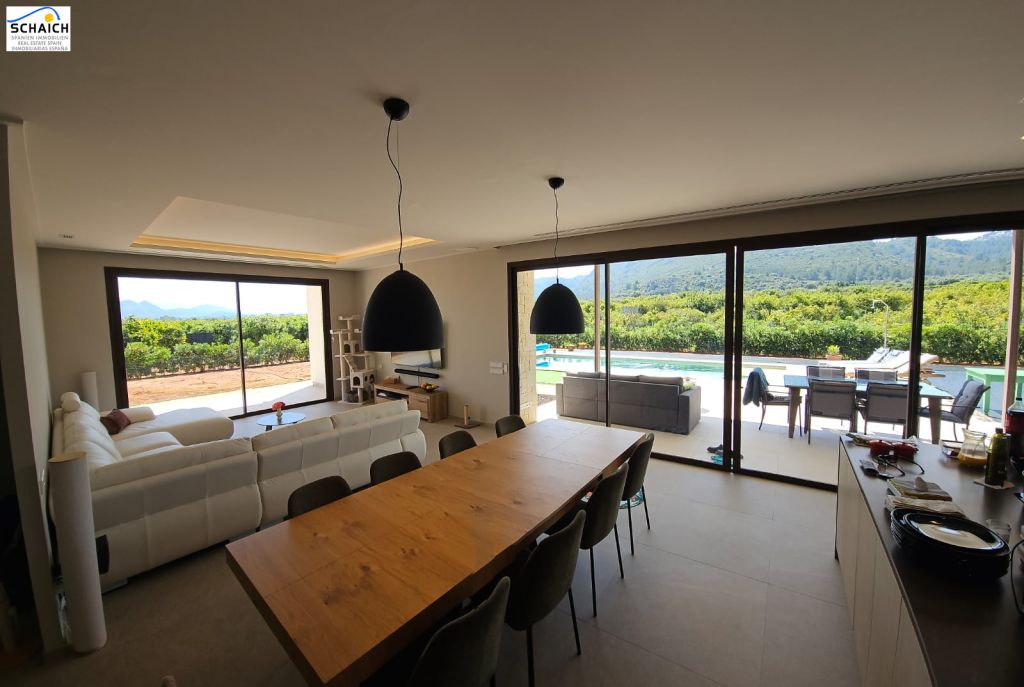 The property sits on one of the best plots in the area, offering panoramic views of the surrounding mountains and villages, surrounded by extensive orange groves. It features a spacious living room with direct access to a large terrace overlooking the 10x4 m heated pool with a heat pump.